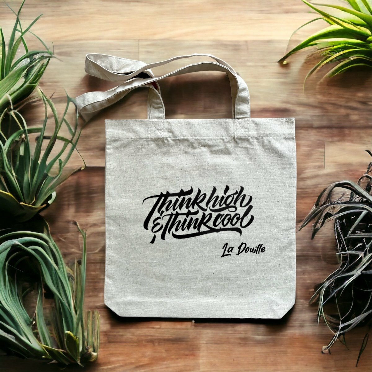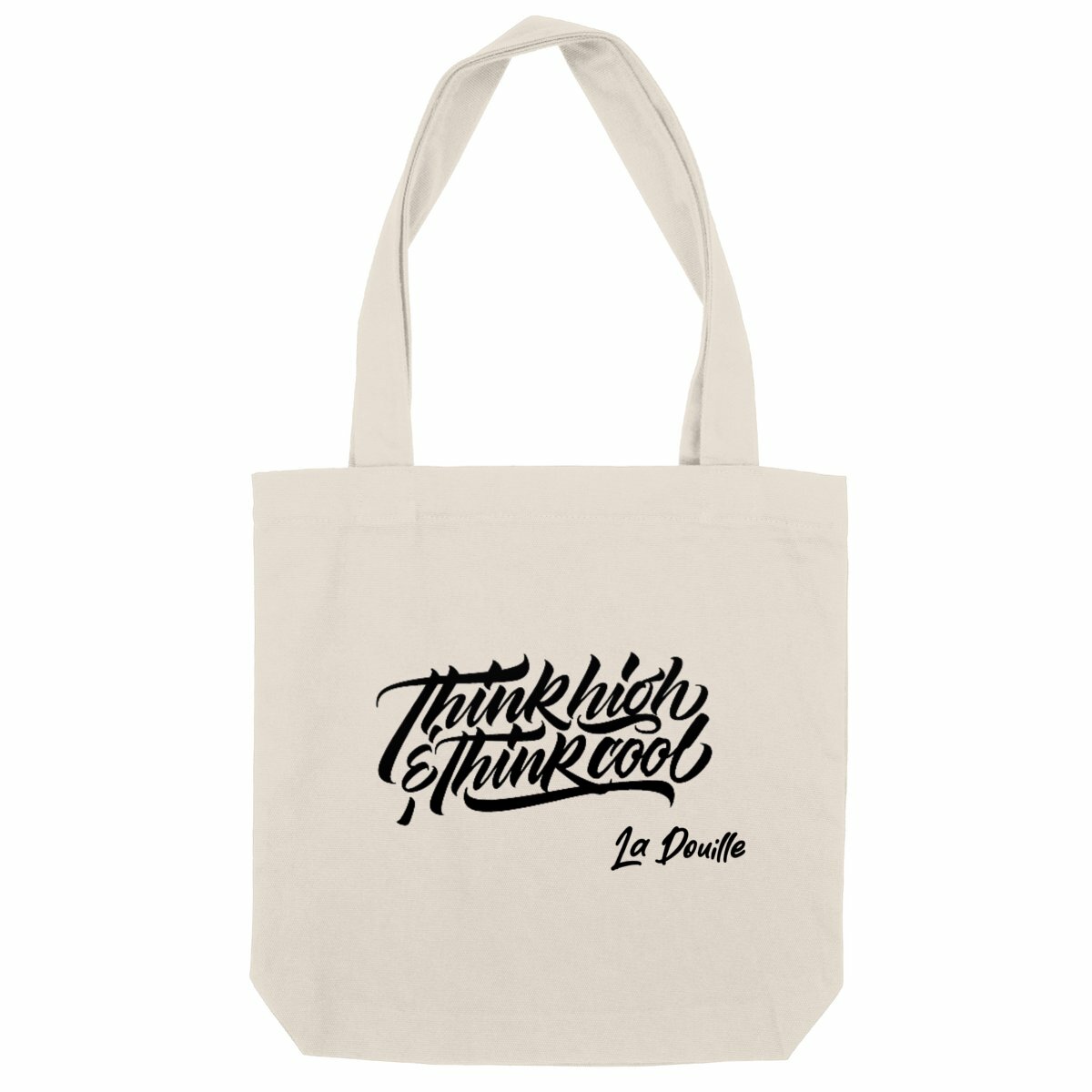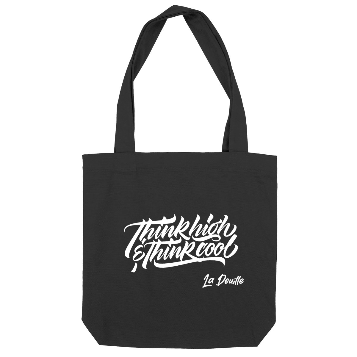 Impression « ThinkHigh&ThinkCool » en noir sur le modèle naturel et en blanc sur le modèle noir.